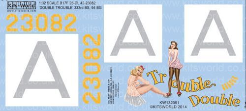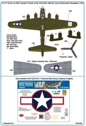 B-17F-25-DL, 42-3082, 'Double Trouble', was flown by Lt William Winnesheik, 333 BS/94 BG, Rougham, England, in October 1943. This ship was assigned to the unit from 10 June 1943 to 4 October 1943, when it crash landed at Margate, England, after a combat mission to St. Dizier, France.