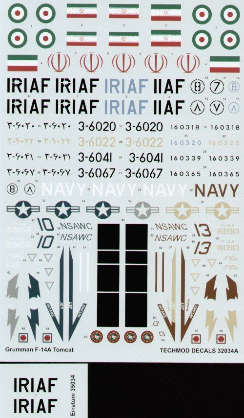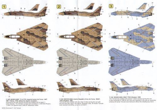 160365 / 3-6067 73rd TFS Imperial Iranian Air Force 1978; 160318 / 3-6020 Islamic Republic of Iran Air Force both in desert camouflage schemes FS30400/30140/34079; 160320 / 3-6022 IRIAF 1995 FS35450/33578; 160339 3-6041 IRIAF 2003 FS3622/33578; 159855/10 NSAWC blue/grey Aggressor scheme 1998; 160913/13 NSAWC tan/green Aggresor scheme. Both NAS Fallon
