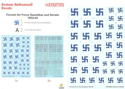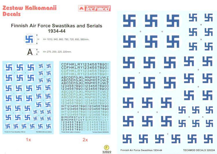 Finnish Air Force Swastika National Insignia. 7 sizes on white backgrounds 1944-45 plus 2 sheets of Finnish Serial Letters and Numbers in black, 3 large sheets