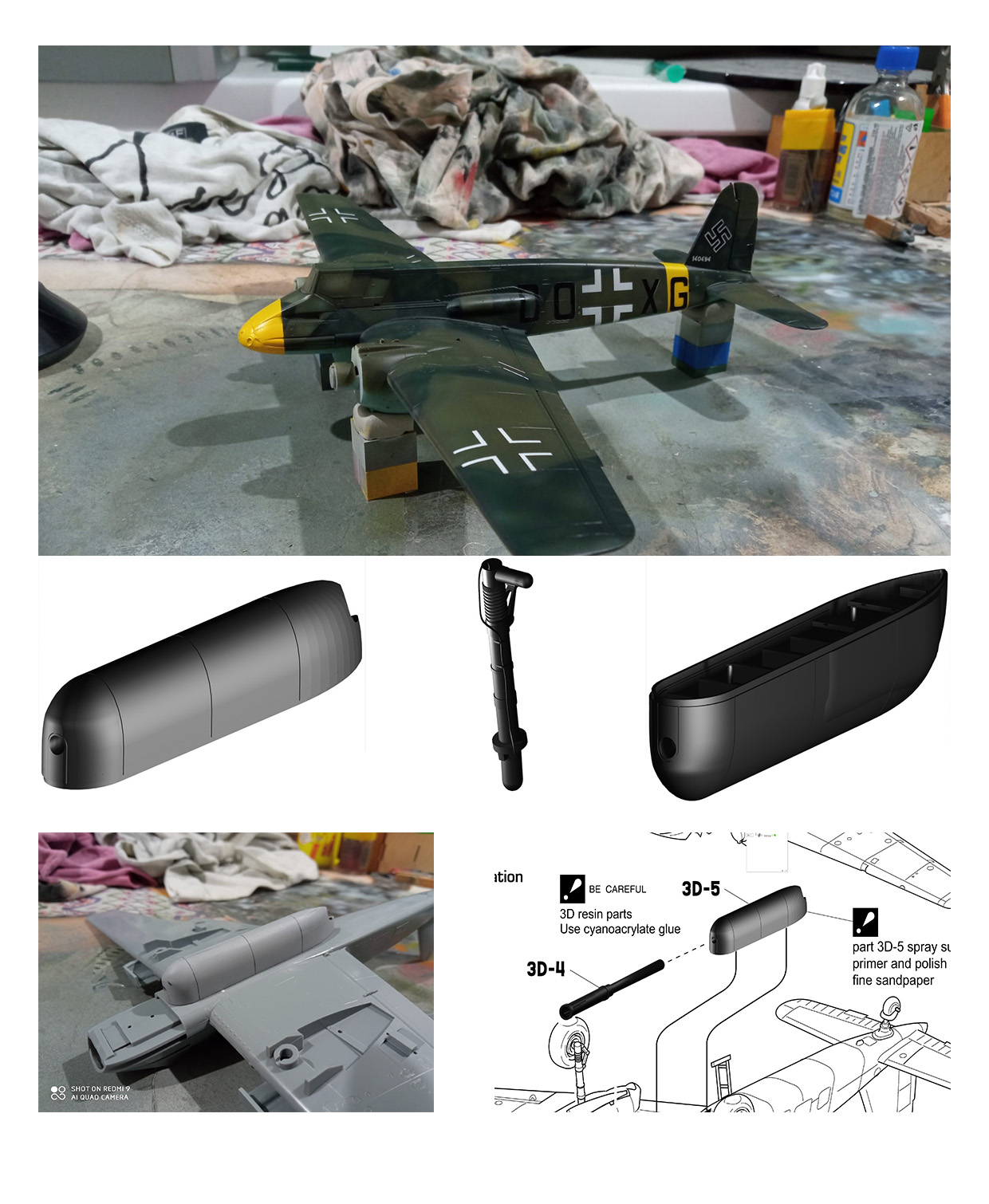 Předně jde o 3D tištěné resinové díly znázorňující podvěšený kanon a jeho kryt, dále výfuky a také podvozkové nohy - ty originální ve stavebnici hyzdí stopy po vyhazovačích, resinové jsou navíc doplněny hadičkami. 3D díly je třeba přestříkat surfacerem a vyleštit, odstraníme tak jemné vrstvení, což je důsledek použité technologie výroby. Dalším doplňkem jsou masky na kola a čiré díly ze žluté maskovací pásky. Masky na kabinu jsou oboustranné. Model obsahuje návod s jednou kamufláží. Letounů s tímto kanonem nelétalo mnoho a dá se říct, že co kus, to originál. Výrobce vybral stroj s označením DO+XG výrobního čísla 140094 z letiště v Rechlinu. Obtisky jsou vytištěny ve velmi dobré kvalitě a obsahují i popisky a obtisky na přístroje v kokpitu.