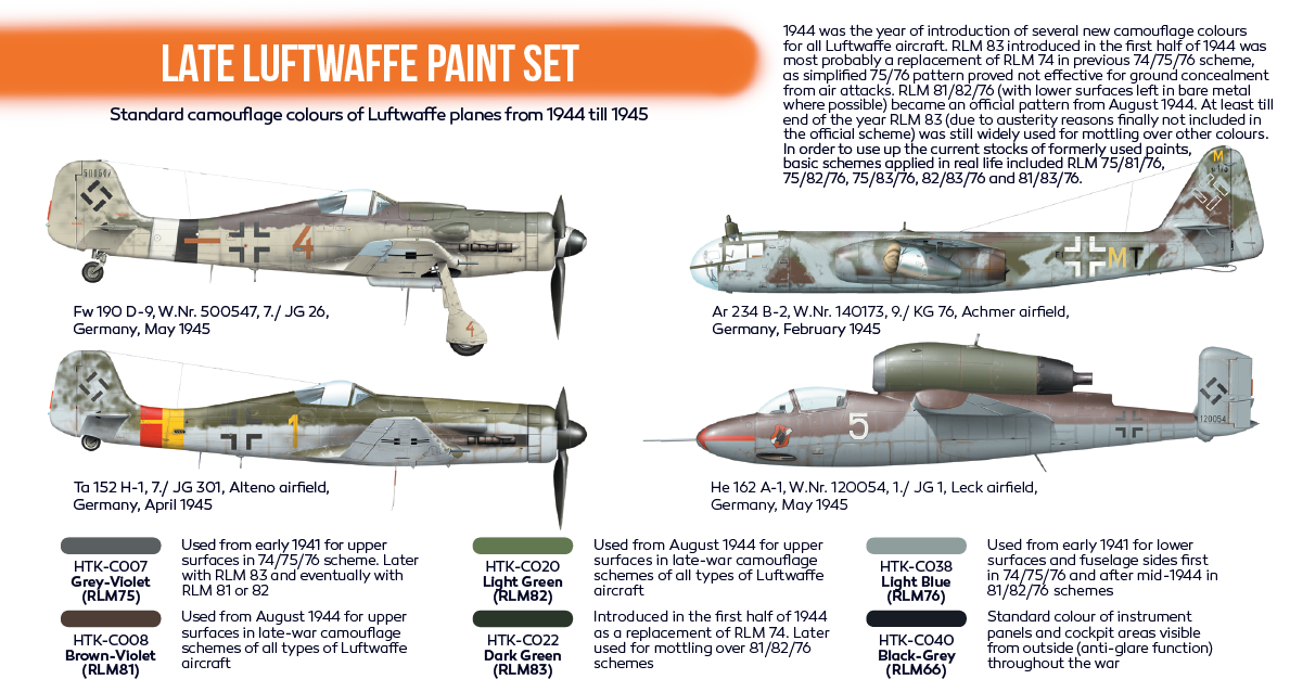 • HTK-C020 – Light Green – RLM82 – Used from August 1944 for upper surfaces in late-war camouflage schemes of all types of Luftwaffe aircraft